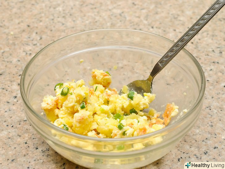 Зробіть картопляну суміш.змішайте 2 чашки тертого сиру чеддер, 1 пучок дрібно нарізаної зеленої цибулі і 4 ст.л. порізаного бекону з картоплею в мисці. Добре перемішайте всі інгредієнти.