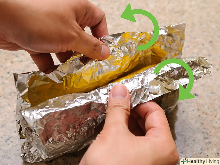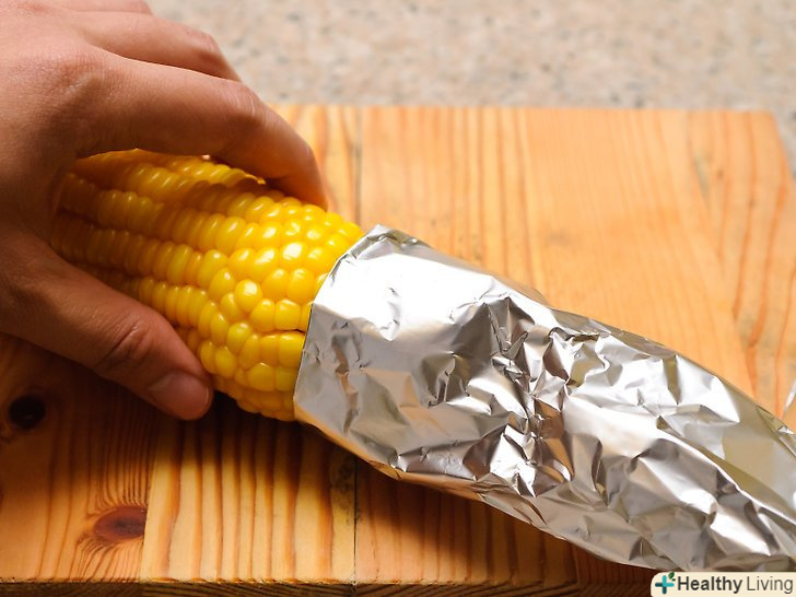 Запечатайте фольгу.нещільно загорніть в неї кукурудзу, накрийте качани і підверніть краю.- Покладіть загорнуту у фольгу кукурудзу на сухе деко. Накривати його не потрібно. Бажано скласти кукурудзу в один ряд, а не гіркою.