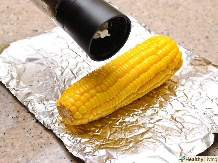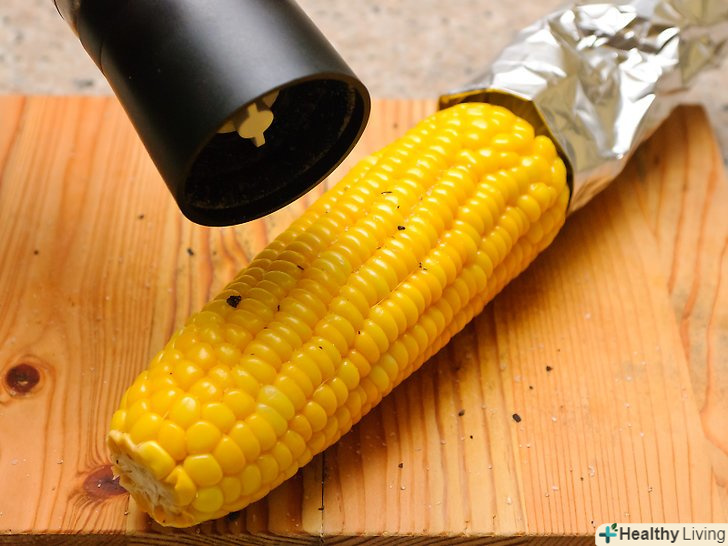 - Розгорніть кукурудзу і проткніть одне з зерен нігтем або виделкою. Якщо страва готова, з нього потече сік.[5] якщо цього не сталося, нещільно загорніть кукурудзу в фольгу і покладіть назад в духовку ще на кілька хвилин.