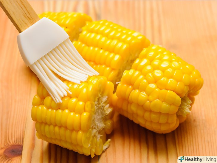 Змастіть кукурудзу рослинним маслом і посипте приправами.розкладіть шматочки на великому деку, який попередньо вже накритий алюмінієвою фольгою. Трохи змастіть їх оливковою або розтопленим вершковим маслом і посипте сіллю і перцем (за бажанням).- Для духовки найбезпечніше використовувати оливкову олію. Воно не так сильно піниться і бризкає, як вершкове. Кукурудза в шматочках готується відносно швидко, так що в цьому випадку підійде будь-який з них.