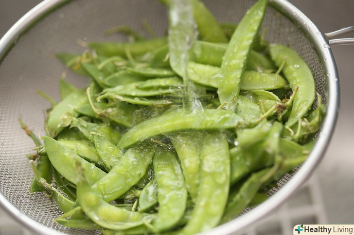 Висипте сніговий горох в друшляк.помістіть друшляк з горохом в миску з холодною водою. Ретельно промийте його.
