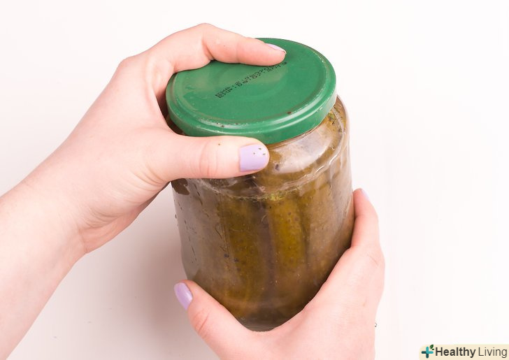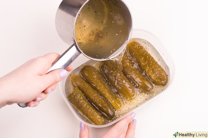 Закрутіть кришки на банках і залиште огірки прогріватися на низькій температурі (процес пастеризації).Слідкуйте за тим, щоб кришки не здулися і не тріснули банки, інакше огірки зіпсуються.- Поставте банки у велику каструлю, заповнену наполовину теплою водою (50-60 °С). Потім залийте їх гарячою водою, щоб її рівень був вище банок на пару см.