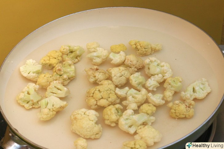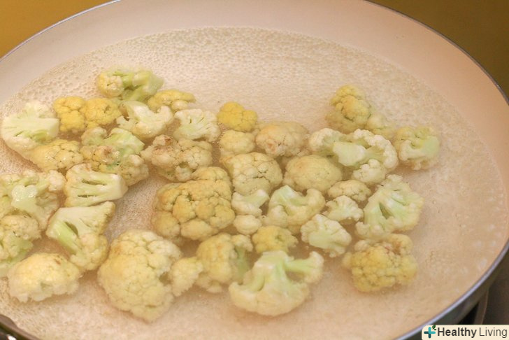 Розріжте на суцвіття качан цвітної капусти і обварити в киплячій воді протягом 3 хвилин.обварювання означає, що не потрібно готувати капусту до кінця. Дістаньте з каструлі і злийте воду.