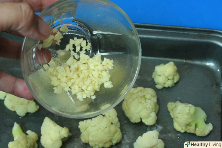 Покладіть кольорову капусту на деко або форму для запікання. Додайте наступне:- 2-3 зубчики грубо подрібненого часнику