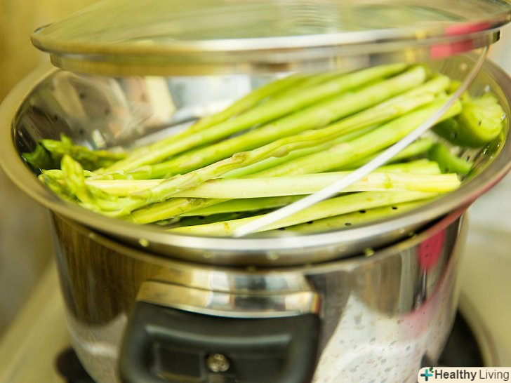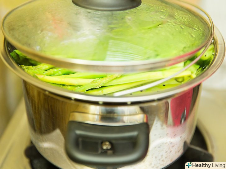 Покладіть спаржу в каструлю і накрийте кришкою.помістіть пароварку на плиту, якщо ви все ще цього не зробили.