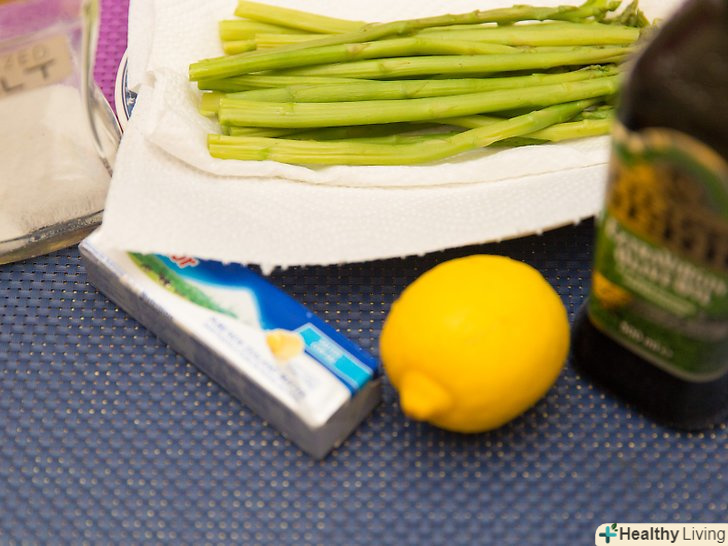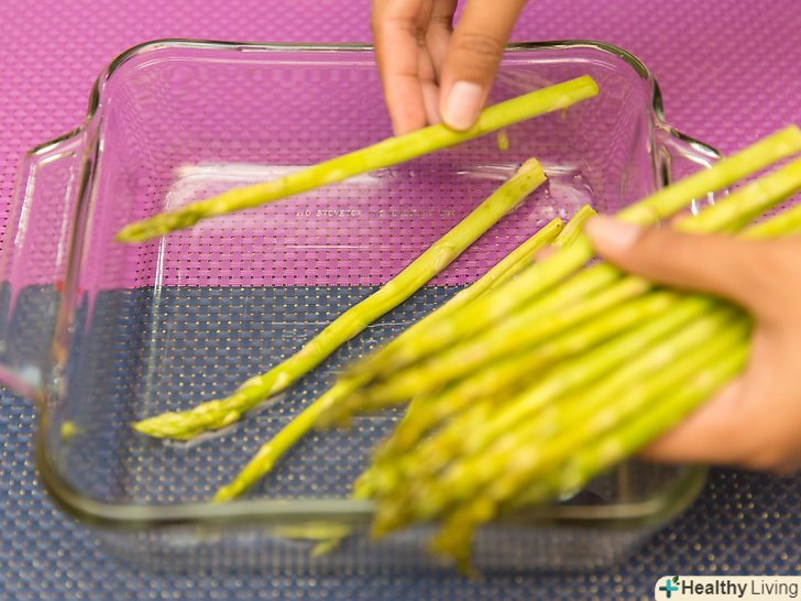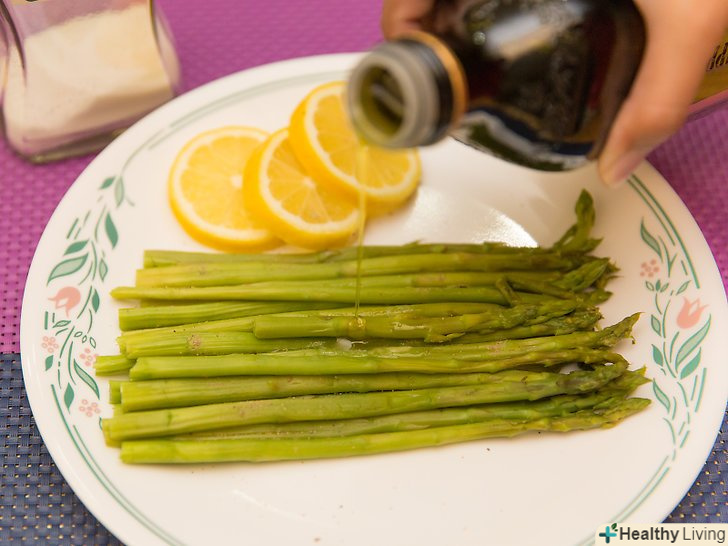 Приправте спаржу оливковою олією, цедрою лимона, сіллю і перцем.змішайте 2 столові ложки оливкової олії і ½ чайні ложки цедри лимона. Полийте спаржу цією сумішшю. Злегка посоліть і поперчіть.[6]