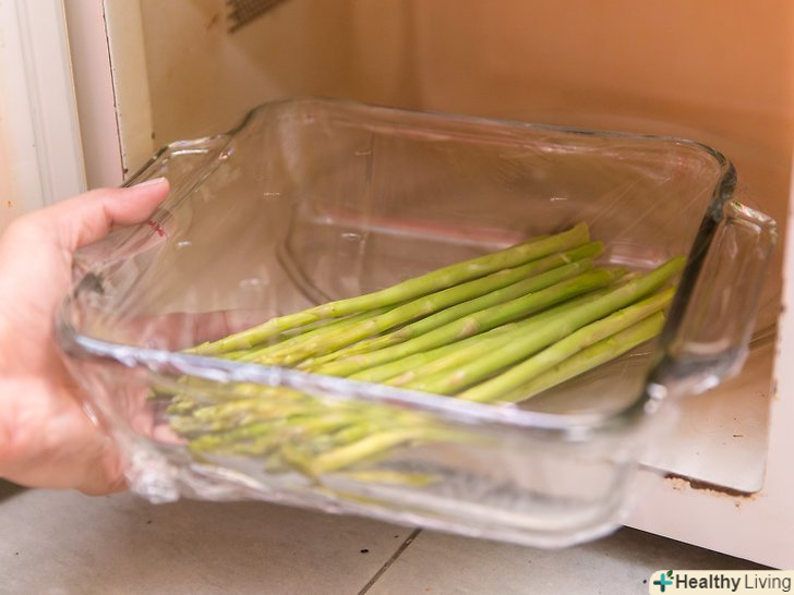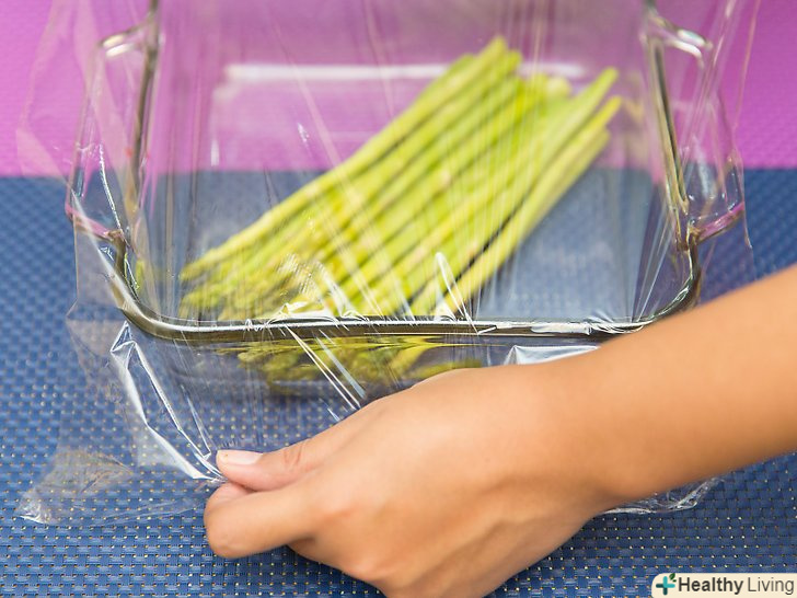 Накрийте блюдо зі спаржею харчовою плівкою.проведіть пальцем по краю тарілки, щоб запечатати її. Обов'язково заправте плівку під тарілку.