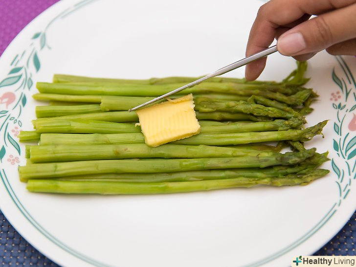 Приправте спаржу невеликою кількістю оливкової або вершкового масла.оливкова олія додасть спаржі аромат, а вершкове зробить її смак ще більш насиченим.
