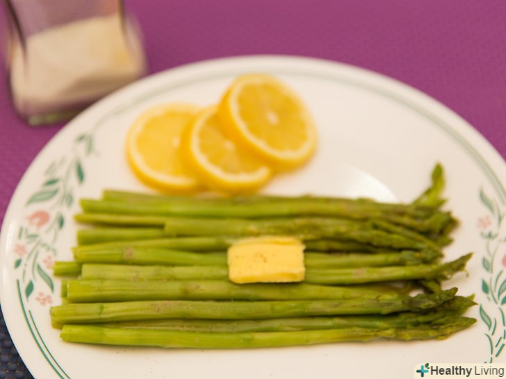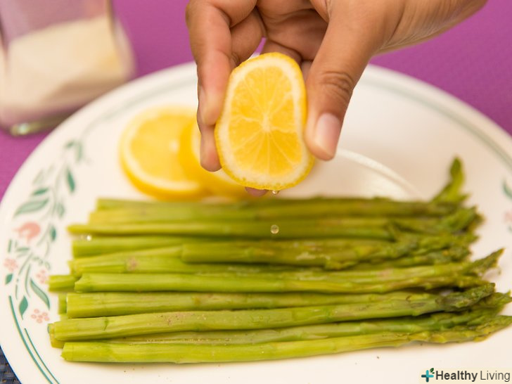 Приправте спаржу соком лайма і часниковою сіллю.вам знадобиться 1 чайна ложка часникової солі і сік половинки лайма.[8] цієї кількості вистачить на 225 грам спаржі.