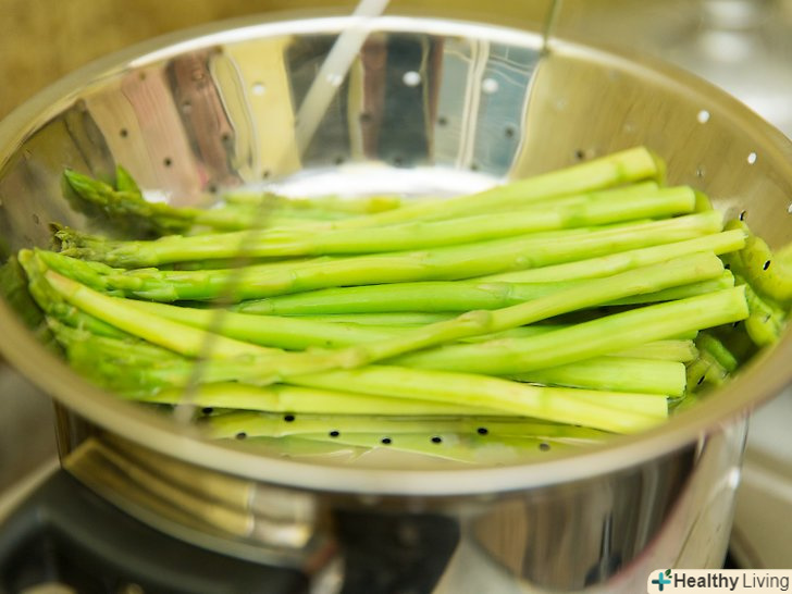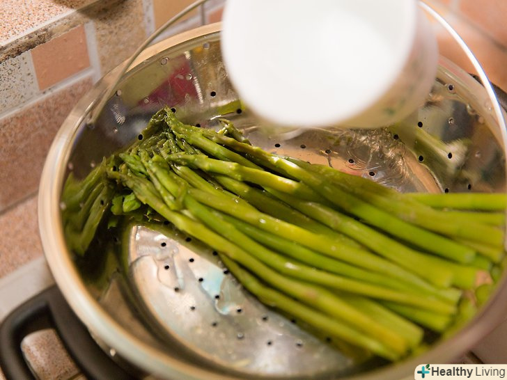 Подавайте спаржу в холодному вигляді.Киньте приготовлену на пару спаржу в холодну воду з льодом. Це охолодить спаржу, зберігши при цьому її яскраво-зелений колір і хрустку текстуру. Ви також можете викласти спаржу в друшляк і залити її холодною водою.[9]