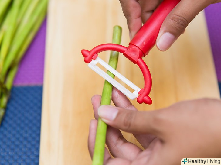 Використовуйте овочечистку, щоб очистити спаржу від шкірки.почніть чистити шкірку, відступивши 5 см від кінчика.[13] для тонкої спаржі це необов'язково робити, проте тверді стебла краще очистити. Спаржа після приготування буде жорсткою і волокнистою, якщо ви цього не зробите.