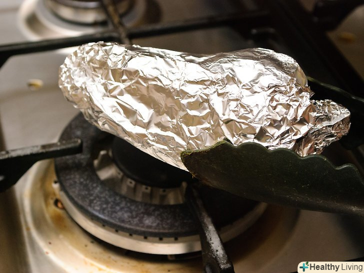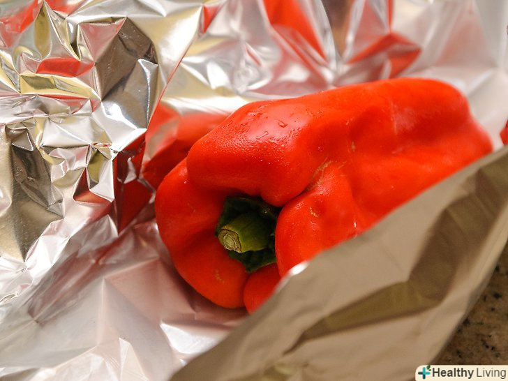 Зніміть перець з плити і пропарьте.нехай протягом 15-20 хвилин у фользі. Перець пропариться в фользі, це допоможе шкірці відокремитися, і вона буде легше чиститися.