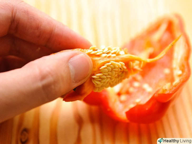 Наріжте перець і зніміть верхівки.покладіть червоні перці на обробну дошку. Відріжте верхній, стовбуровий кінець, роблячи розріз прямо через весь перець. Розріжте кожен червоний перець уздовж навпіл. З'їжте кінець стебла перцю або покладіть його в холодильник, щоб використовувати пізніше. Використовуйте паперовий рушник або ложку, щоб витягнути насіння з перцю. Якщо ви залишите насіння - це не зашкодить, але у перцю з насінням буде неприємний смак.- Деякі люди просто смажать його повністю, а потім розрізають і видаляють насіння. Це теж підійде, але це зробить роботу з перцем трохи складніше. Якщо ви зробите це, то також повинні вручну перевертати ці перці кожні кілька хвилин, так що ви додасте собі ще трохи роботи. Також цілий перець, швидше за все, буде готуватися 40 хвилин, замість 20-ти хвилин, коли перець порізаний навпіл.