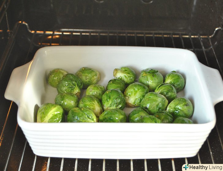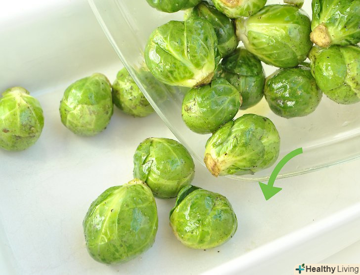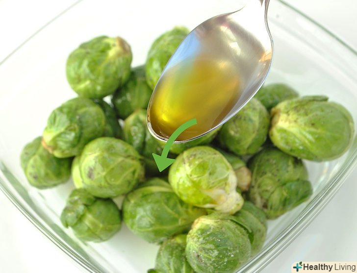 Покладіть брюссельську капусту в миску і додайте спеції.збризніть капусту 3 столовими ложками (45 мл) оливкової олії і посипте 3/4 чайної ложки чайної ложки солі і 1/2 чайної ложки чорного перцю.