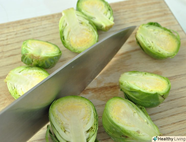 Розріжте брюссельську капусту навпіл.розріжте капусту на половинки від верхівки до стебла, і зробіть в стеблі надріз глибиною близько 1,5 см.