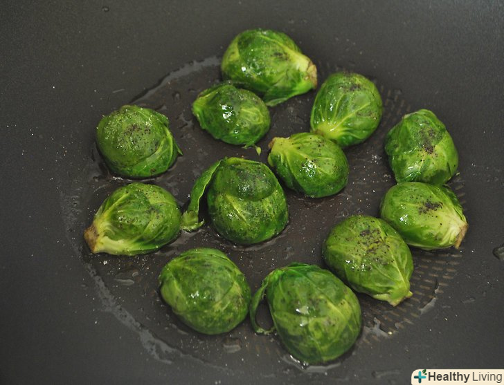 Покладіть брюссельську капусту в сковороду, розрізом вниз, і додайте спеції.посоліть і поперчіть капусту на свій смак.