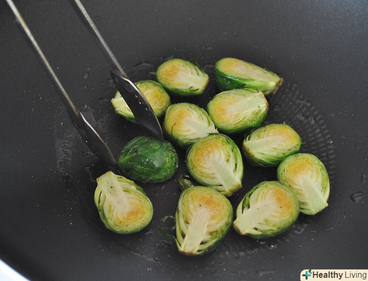 Підсмажте брюссельську капусту.смажте її на одній стороні протягом 5 хвилин, поки вона не стане золотисто-коричневого кольору, потім переверніть на іншу сторону.