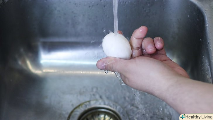 - Постукайте тупим кінцем яйця об раковину 1-3 рази.після того як яйце кілька секунд пробуде під струменем холодної води, кілька разів постукайте їм об раковину. Найкраще стукнути яйце з тупого кінця. В результаті шкаралупа трісне, і ви зможете легко її зняти.[7]