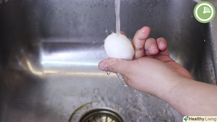 Потримайте яйце під струменем холодної води протягом 5-15 секунд.обхопіть зварене круто яйце рукою і приблизно на 5-15 секунд підставте його під холодну воду.[6]- При бажанні можна потримати яйце під холодною водою менше або довше. Щоб яйце встигло охолонути, воно повинно знаходитися під проточною холодною водою деякий час.