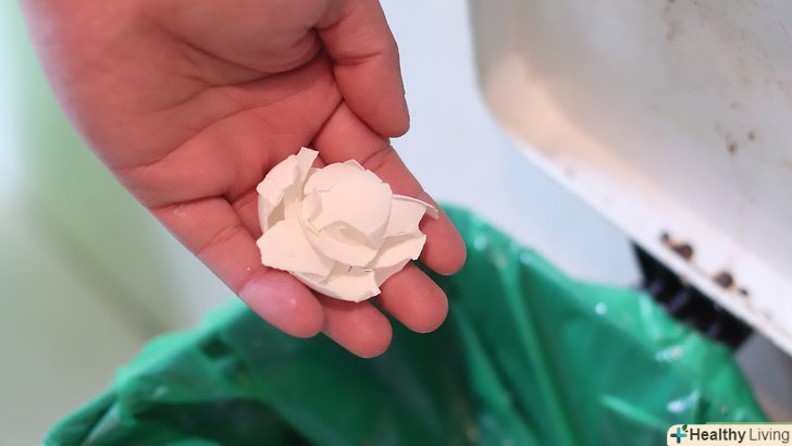 Зберіть шкаралупу і викиньте вЯщик для компосту або відро для сміття.вимкніть воду і покладіть очищені яйця в тарілку або миску. Після цього зберіть з раковини шкаралупу. Яєчна шкаралупа прекрасно підходить для компосту! Якщо у вас немає ємності для компосту, можна просто викинути шкаралупу у відро для сміття.- Краще прикрити зливний отвір раковини гратами, щоб шкаралупа не потрапила в трубу.