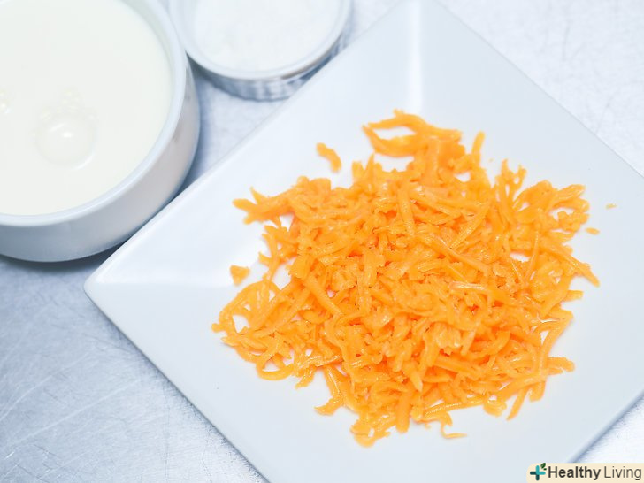 Підготуйте все необхідне.якість вихідних інгредієнтів може вплинути на якість сирного соусу. Для початку візьміть сир чеддер, тертий або у вигляді цілісного шматка. Якщо сир у вигляді шматка, потріть його на тертці так, щоб вийшло 2 склянки (близько 250 грамів).[1][2]- Замість чеддера можна використовувати сир гауда або швейцарський сир.