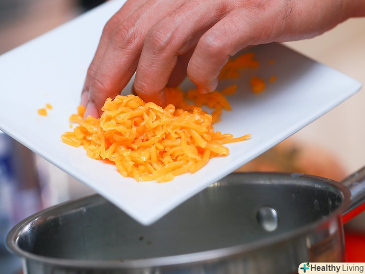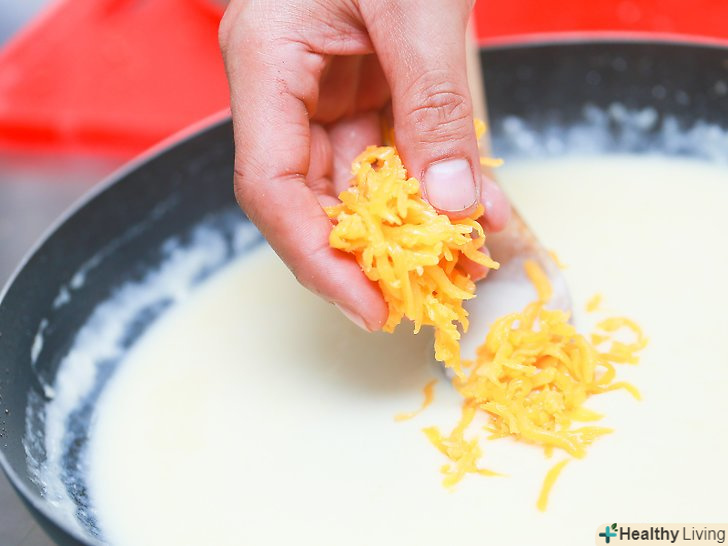 Додайте в каструлю тертий сир.покладіть сир в каструлю і перемішуйте інгредієнти ложкою, поки сир не розплавиться і змішається з рідиною. Цитрат натрію повинен надати соусу однорідну густу консистенцію.[13]