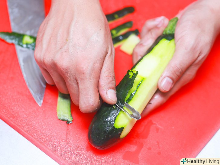 Приготуйте кабачки.Розігрійте духовку до 215 °C і застеліть деко пергаментним папером. Зніміть з кабачків зелену шкірку за допомогою ножа для чищення овочів. Після цього наріжте кабачки скибочками товщиною близько 0,5 сантиметра і викладіть їх на деко.[17]- Приправте скибочки кабачків дрібкою солі і перцю. Запікайте їх 15 хвилин, поки вони не стануть м'якими на дотик.