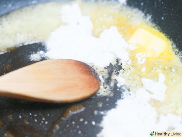 Додайте 4 столові ложки (35 грамів) борошна.поступово додайте до масла борошно, помішуючи вміст каструлі мутовкой. Як слід перемішайте масло і борошно, щоб вийшла однорідна маса.[4]- Розігрівайте суміш протягом декількох хвилин, поки вона не почне трохи змінювати свій колір. Будьте уважні, щоб суміш не пригоріла, інакше сирний соус буде мати Горілий присмак.