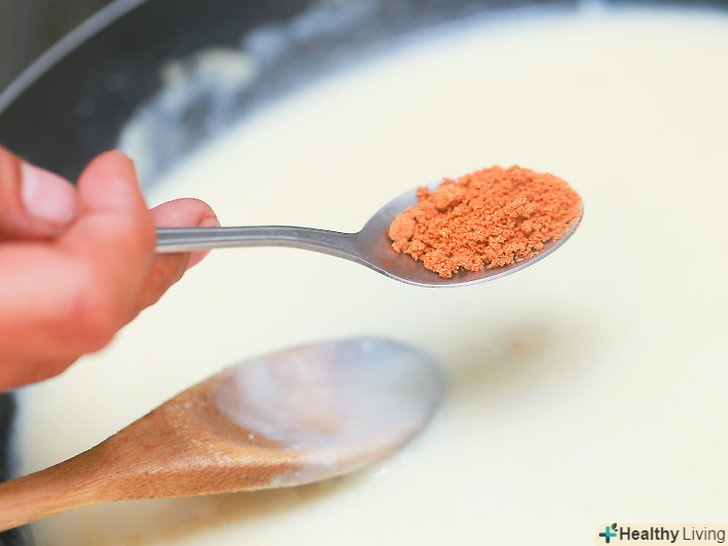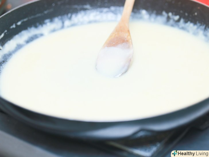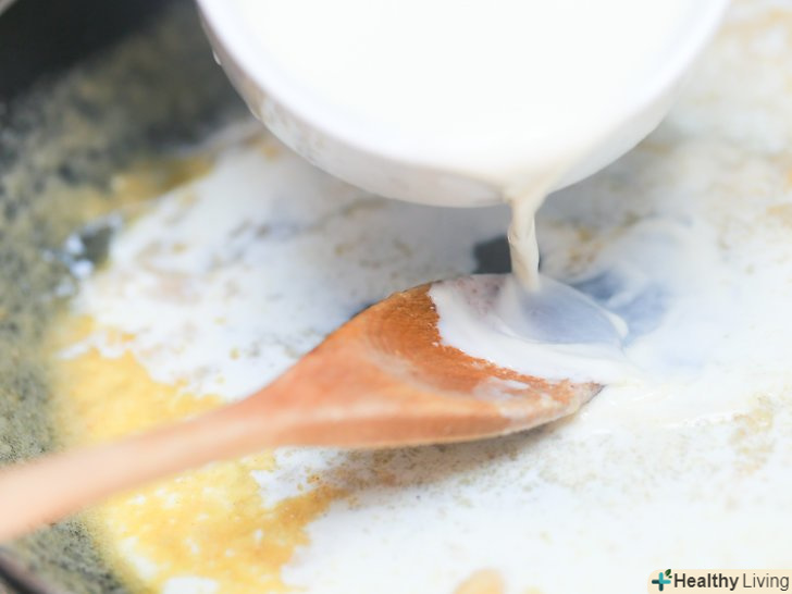 Додайте 3 склянки (710 мілілітрів) молока.не поспішаючи залийте молоко і безперервно помішуйте вміст каструлі, поки воно не загусне.[5]- Постарайтеся, щоб в суміші не було грудок. Для цього повільно заливайте молоко і безперервно помішуйте вміст каструлі.