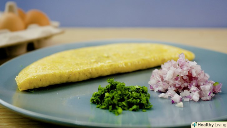 - Перекладіть омлет на тарілку і згорніть його навпіл.вимкніть вогонь і обережно перекладіть омлет на тарілку. Якщо омлет пристав до сковороди, подденьте його лопаткою. Потім лопаткоюзагніть омлет з одного боку і складіть його навпіл. Посипте омлет дрібно нарізаною зеленою цибулею і подайте його на стіл, поки він гарячий і пишний.