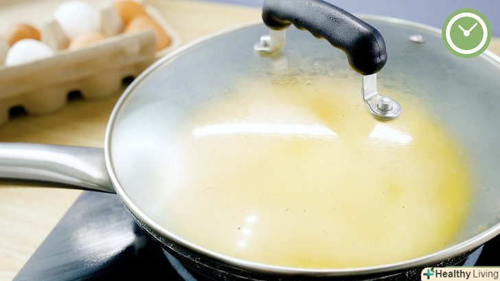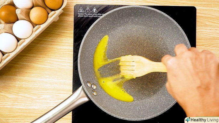 Розтопіть 1 столову ложку (15 грамів) вершкового масла на сковороді з антипригарним покриттям.Увімкніть середній вогонь, покладіть на сковороду несолоне масло і почекайте, поки воно розтопиться. Тримайте сковороду за ручку і повільно обертайте її, щоб масло покрило дно.[5]- Якщо ви не хочете використовувати вершкове масло, замість нього можна взяти оливкове або кокосове масло, або топлене масло. візьміть для приготування омлету сковороду діаметром близько 25 сантиметрів.