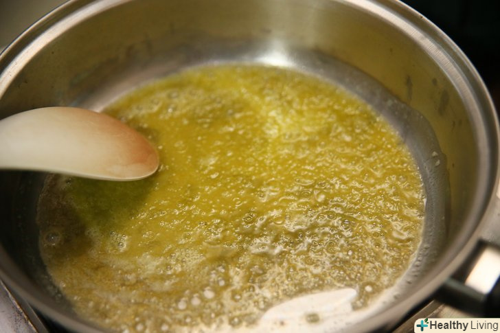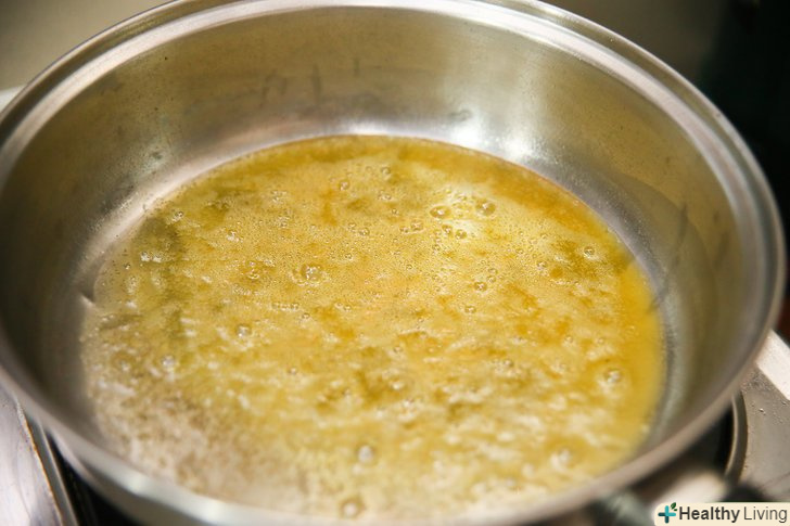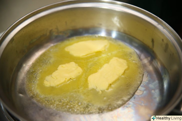 Покладіть масло в каструлю з товстим дном.покладіть скибочки масла на товсте дно каструлі-це важливо, оскільки каструлі з тонким дном можуть нагріватися нерівномірно і створять гарячі точки - що погано для масла.- Також краще використовувати світлу каструлю, наприклад, з нержавіючої сталі, так як це дозволить вам більш точно побачити колір її змісту, що дуже важливо при приготуванні темного вершкового масла.
