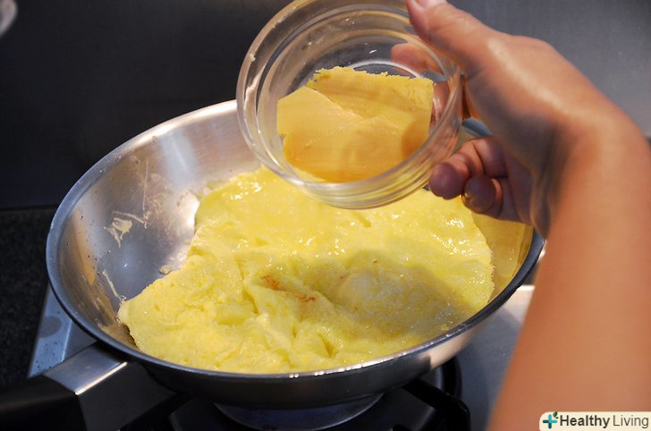 Перемішайте яйця лопаткою, а потім покладіть сир в яйця, коли вони підрум'яняться.