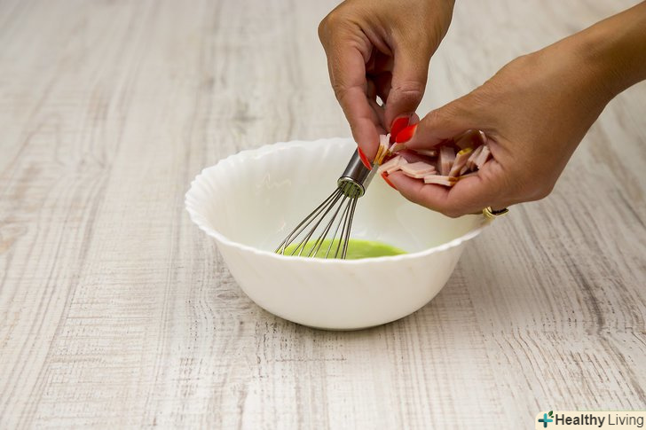 Додайте в миску шинку, порізану кубиками.поріжте 1-2 шматочки шинки на маленькі кубики. Їх розмір повинен бути близько 1 сантиметра. Вам знадобиться столова ложка порізаної на кубики шинки. Додайте шинку в миску. Перемішайте гумовою лопаткою.
