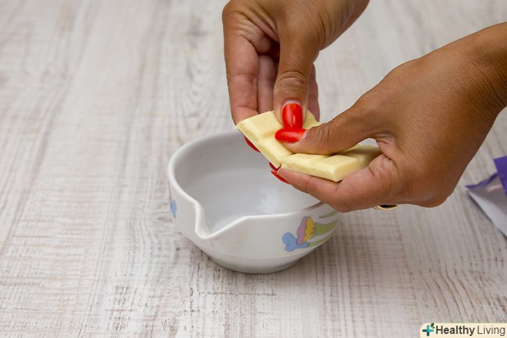 Розтопіть білий шоколад. Використовуйте кілька шматочків білого шоколаду. Помістіть кілька часточок білого шоколаду в посуд для мікрохвильової печі. Поставте миску в мікрохвильову піч на 30 секунд, потім ретельно перемішайте ложкою. Продовжуйте нагрівати шоколад протягом 30 секунд, постійно помішуючи, поки вони повністю не розтануть.