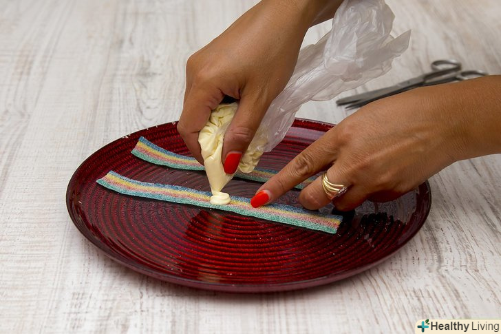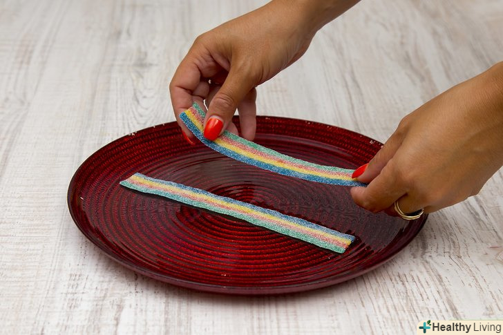 Візьміть фруктові смужки.ви можете використовувати свої улюблені фруктові смужки. Якщо ви дійсно хочете, щоб ваш десерт виглядав як зелені яйця з шинкою, виберіть фруктові смужки зеленого кольору. Вам знадобляться дві фруктові смужки, щоб приготувати одну порцію зелених яєць з шинкою.- Якщо довжина смужок становить більше 5-7 см, розділіть їх навпіл.