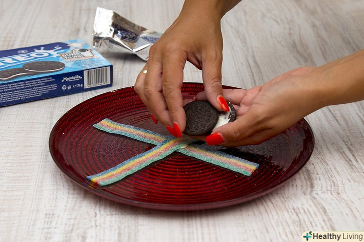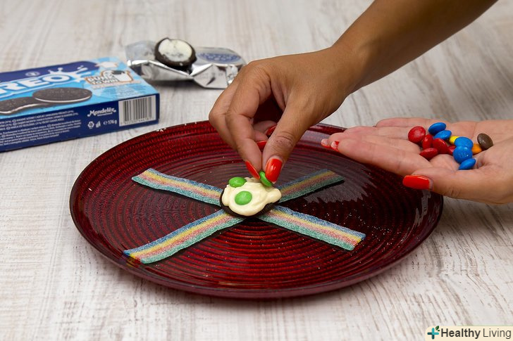 Розділіть печиво Огео на дві частини і помістіть його зверху на фруктові смужки, складені буквою «X».ви також можете використовувати інше печиво. Діаметр печива повинен бути близько 2,5 см.якщо необхідно, видавіть крапельку розплавленого шоколаду і помістіть печиво зверху.
