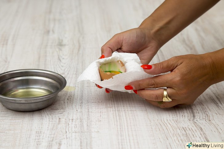 Акуратно витріть зайвий барвник паперовим рушником.відставте блюдце з жовтком в сторону, коли ви закінчите. Якщо ви цього не зробите, харчовий барвник може потрапити на білок і вам не вдасться виконати задумане. У творі Доктора Сьюза зеленими були тільки жовтки, білки залишалися незмінними.- Пропустіть цей крок, якщо ви додали барвник до білка.