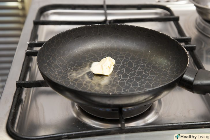 Підігрійте трохи вершкового або рослинного масла в сковороді на середньому вогні.поставте сковороду на плиту. Додайте 1 чайну ложку рослинної або вершкового масла. Увімкніть плиту на середній вогонь і почекайте, поки нагріється сковорода. Нахиляйте сковороду з боку в бік, щоб вся її поверхня була покрита розтопленим маслом.- Коли вершкове масло почне плавитися, а рослинне — шипіти, можна переходити до наступного кроку.