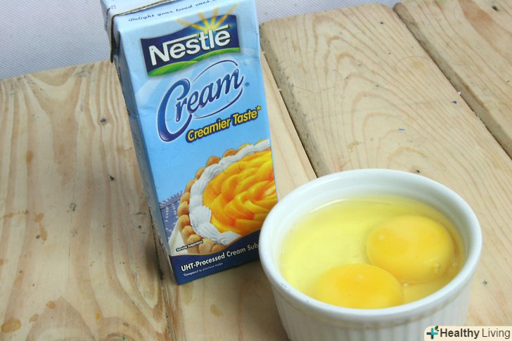 Додайте вершки і яйця в горщики. спочатку налийте в горщики вершки. Потім, обережно розколіть яєчну шкаралупу і вилийте яйця прямо в вершки.- Не розбивайте жовтки і не перемішуйте яйця і вершки разом.