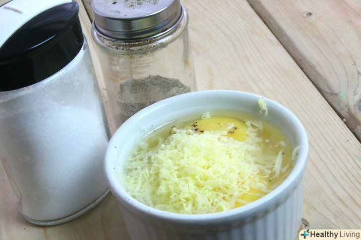 Посипте яйця сіллю, перцем і сиром. посипте спеції на яйця в горщиках, але не перемішуйте вміст в них.