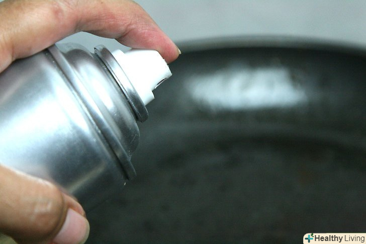Покрийте сковороду антипригарним спреєм. нагрійте її на середньому або сильному вогні.- Дайте сковороді кілька хвилин, щоб гарненько розігрітися. Щоб перевірити температуру, капніть водою на поверхню сковороди. Якщо вода негайно випарується при контакті зі сковородою, значить, сковорода досить розігріта.