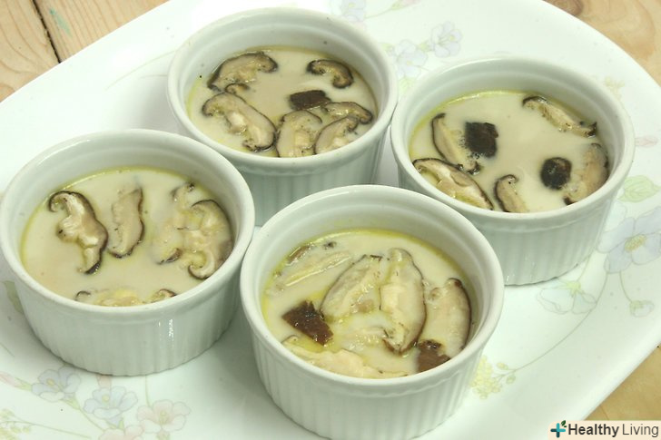 Вилийте яєчну суміш у кожну чашку. у кожен горщик налийте рівну кількість яєчної суміші поверх грибів, поки він не виявиться повністю заповненим.- Горщики слід заповнювати на 1/2 – 3/4 від обсягу.