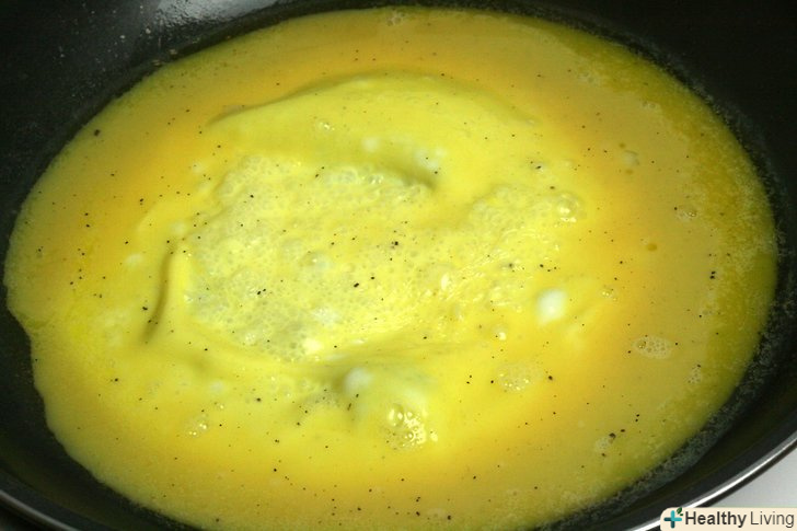 Вилийте яйця на сковороду. вилийте збиті яйця на розпечену сковороду і готуйте до тих пір, поки маса не візьметься по краях.- Готуйте яйця на середньому вогні, щоб не пересмажити їх і не спалити.