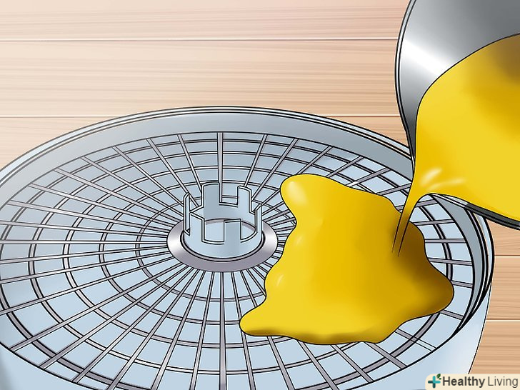 Вилийте яйця в лотки дегідратора. приблизно півдесятка цілих яєць повинні поміститися в кожен стандартний лоток дегідратора. Кожен лоток повинен також тримати один десяток яєчних білків або один десяток яєчних жовтків.- При роботі з сирими яйцями, просто вилийте суміш збитих яєць в кожен лоток. Тонкий шар кращий товстому шару.