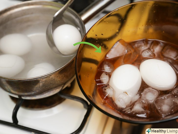 Остудіть яйця. покладіть яйця в миску з льодом або миску з охолодженою в холодильнику водою, щоб зупинити процес їх приготування. Як правило, охолоджені яйця легко чистити. [4]