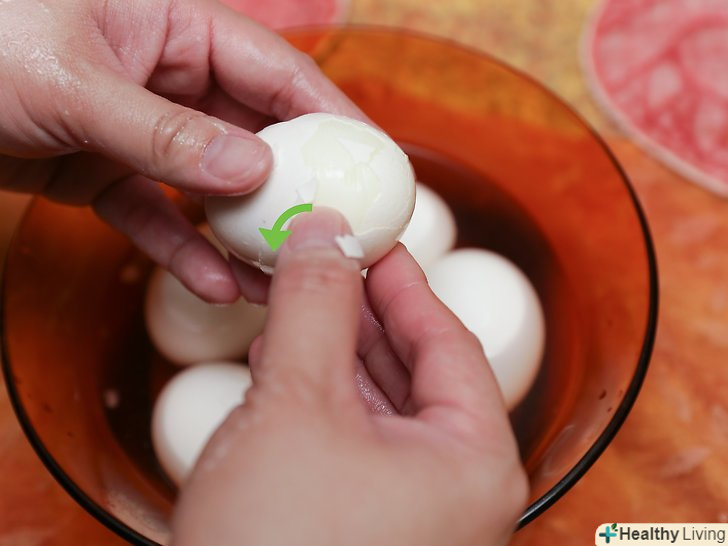 Відваріть шість яєць некруто. доведіть воду в каструлі до кипіння, а потім зменшіть вогонь до такої міри, щоб вона продовжувала булькати. Опустіть шість яєць і варіть їх протягом шести хвилин. Щоб яйця в подальшому краще чистилися, необхідно класти їх в гарячу воду. [1]- Велика кількість яєць в одній каструлі будуть битися один об одного, тому для кращого результату можна готувати їх двома партіями. [2]