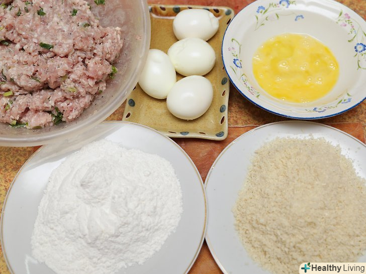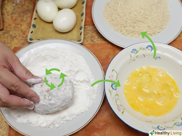 Виваляйте в клярі яйця по-шотландськи. скористайтеся поєднанням інгредієнтів, щоб отримати хрустку скоринку:- Виваляйте в борошні яйця, обгорнуті фаршем