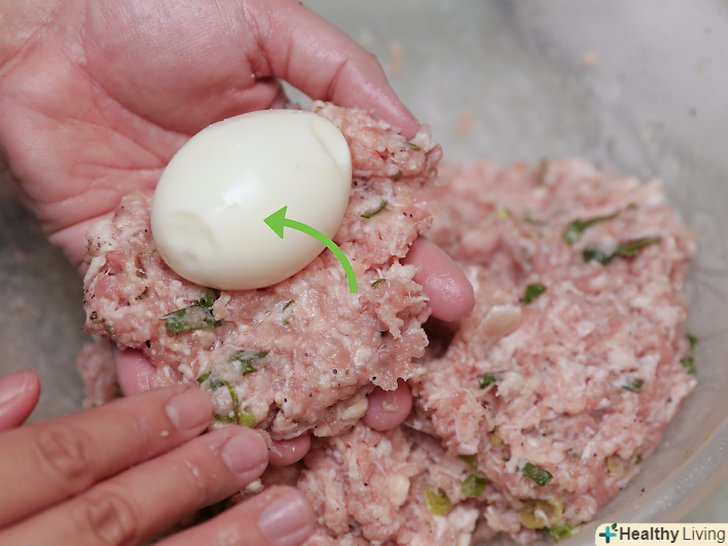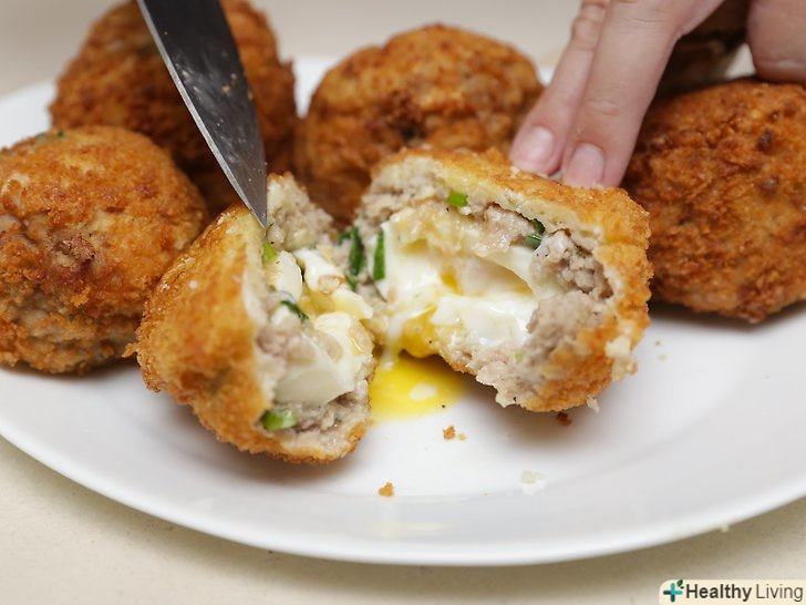 - Час приготування коливається в залежності від кількості ковбасного фаршу на поверхні кожного яйця і рівномірності цього шару. Якщо готовність свинини викликає сумнів, відправте яйця на кілька хвилин в розігріту до 190ºc духовку. [8]