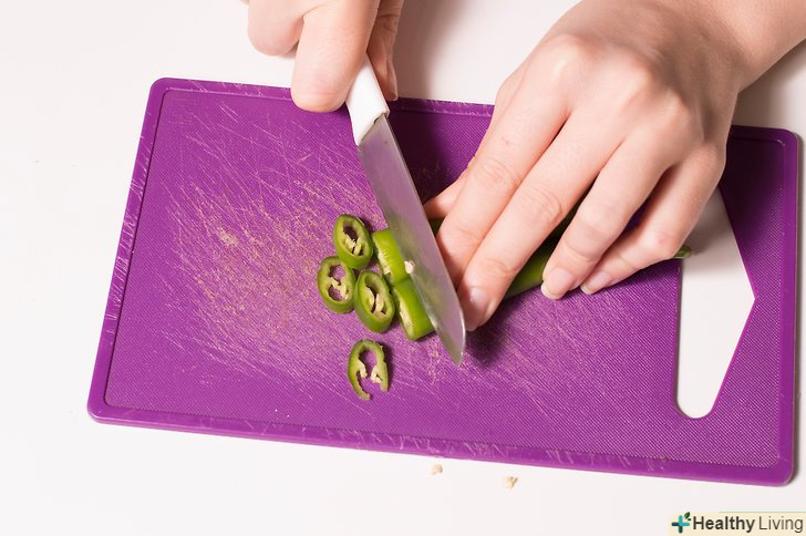 Наріжте перці чилі на шматочки.ви можете нарізати їх уздовж, видалити насіння і внутрішню серцевину, потім нарізати поперек на шматочки довжиною приблизно в сантиметр.